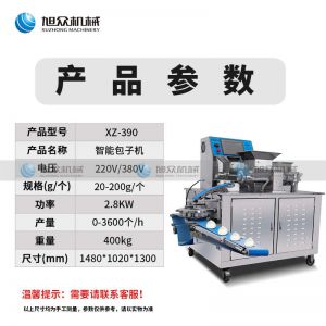 名稱XZ-390智能包子機 電源220V/380V 功率2.8KW 產量0-3600個/h 尺寸1480-1020*1300 重量400kg 規格20-200g/個 其他