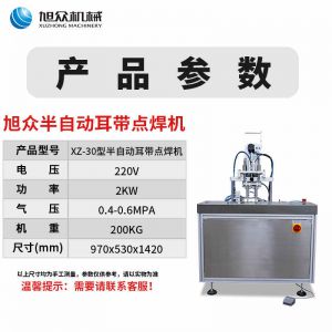 名稱XZ-30型半自動耳帶點焊機 電源220v 功率2kw 產量詳情咨詢13113134411 微信13113134411蔣經理 尺寸970*530*1420MM 重量200kg 規格頻率50HZ 其他氣壓0.4-0.6mpa