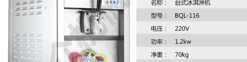 BQL-116臺式冰淇淋機,●選用國際名牌成熟制冷配套件和高效壓縮機,融合旭眾精湛工藝輔以嚴格的質量控制流程,使產(chǎn)品整體性能及品質得以全面提升?!癫捎萌珨?shù)字電腦控制系統(tǒng),選用名牌優(yōu)質電器元件,先進的生產(chǎn)工藝,故障診斷,軟硬任意調制,自動修復功能,安全精確,可靠性更高?!駥I(yè)成熟制冷系統(tǒng)設計,選用世界名牌大功率專用壓縮機,大大縮短冰淇淋成型時間,相同時間內冰淇淋產(chǎn)量大幅度增加,使您生意火爆時依然得心應手,為您創(chuàng)造財富?!癜踩椒€(wěn)的機械攪拌系統(tǒng),噪音更低、振動更小,使整機運行性能達到國際先進水平。●確保進料溫度在0°C~35°C;環(huán)境溫度5°C~40°C勻可正常使用。