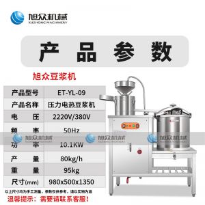 ET-YL-09壓力電熱豆?jié){機(jī),多功能商用豆?jié){機(jī),細(xì)、香、濃。我們珍惜每一顆大豆,讓每顆大豆進(jìn)發(fā)營(yíng)養(yǎng)價(jià)值。旭眾豆?jié){機(jī)做您的招牌豆?jié){打磨細(xì)膩、口感香濃、回味無窮。