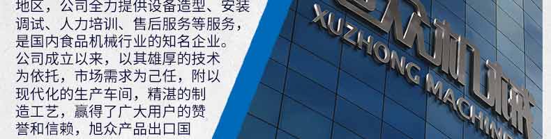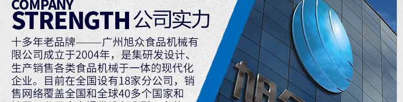 廣州旭眾食品機械有限公司是一家集科研開發(fā),生產(chǎn)設計,營銷服務為一體的現(xiàn)代化生產(chǎn)企業(yè)。現(xiàn)代化生產(chǎn)車間,精湛制造技術,所產(chǎn)機械歷經(jīng)市場重重考驗,不斷贏得海內(nèi)外客戶的贊譽。