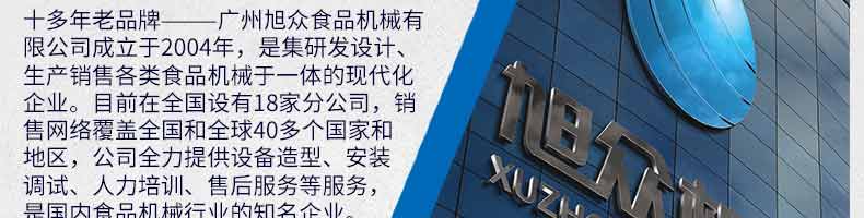 廣州旭眾食品機(jī)械有限公司是一家集科研開發(fā),生產(chǎn)設(shè)計(jì),營銷服務(wù)為一體的現(xiàn)代化生產(chǎn)企業(yè)?,F(xiàn)代化生產(chǎn)車間,精湛制造技術(shù),所產(chǎn)機(jī)械歷經(jīng)市場重重考驗(yàn),不斷贏得海內(nèi)外客戶的贊譽(yù)。