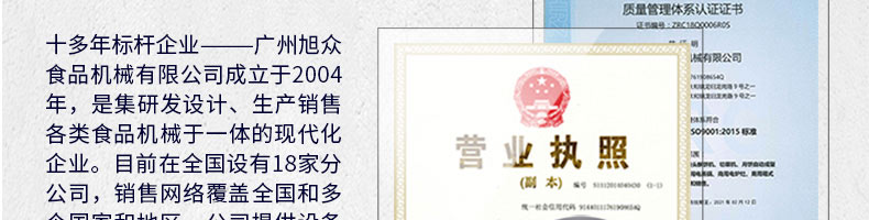 廣州旭眾食品機械有限公司是一家集科研開發(fā),生產(chǎn)設計,營銷服務為一體的現(xiàn)代化生產(chǎn)企業(yè)?,F(xiàn)代化生產(chǎn)車間,精湛制造技術,所產(chǎn)機械歷經(jīng)市場重重考驗,不斷贏得海內外客戶的贊譽。