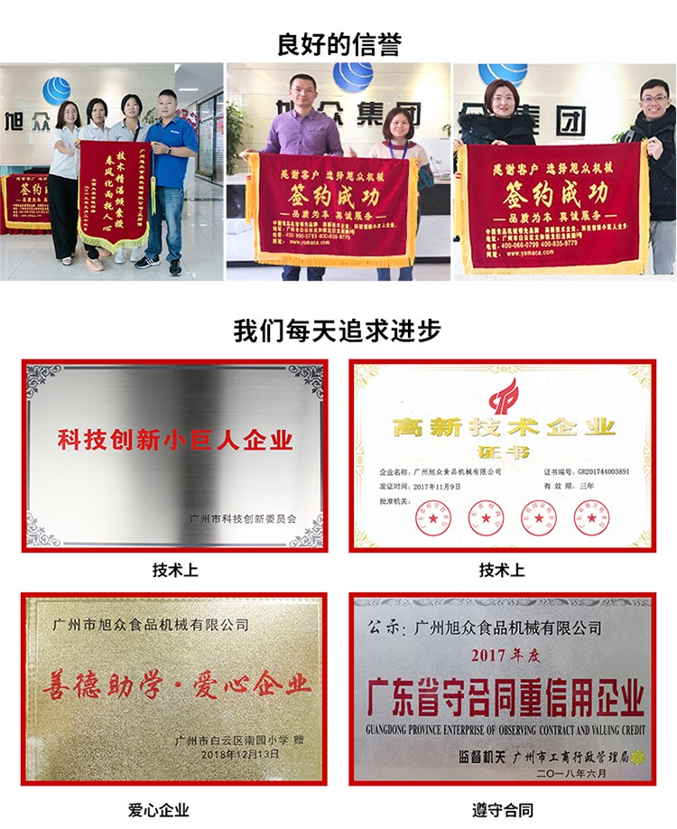 廣州旭眾食品機械有限公司是一家集科研開發(fā),生產設計,營銷服務為一體的現(xiàn)代化生產企業(yè)。現(xiàn)代化生產車間,精湛制造技術,所產機械歷經市場重重考驗,不斷贏得海內外客戶的贊譽。