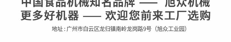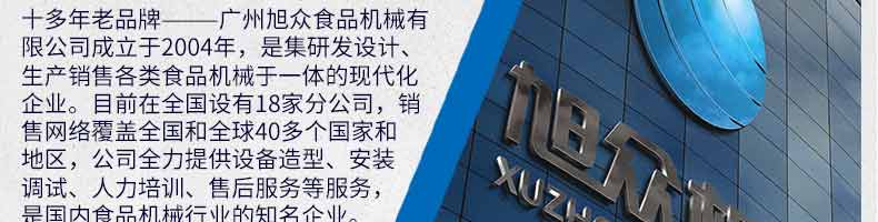 廣州旭眾食品機(jī)械有限公司是一家集科研開發(fā),生產(chǎn)設(shè)計(jì),營銷服務(wù)為一體的現(xiàn)代化生產(chǎn)企業(yè)?,F(xiàn)代化生產(chǎn)車間,精湛制造技術(shù),所產(chǎn)機(jī)械歷經(jīng)市場(chǎng)重重考驗(yàn),不斷贏得海內(nèi)外客戶的贊譽(yù)。