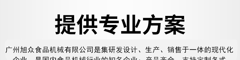 廣州旭眾食品機(jī)械有限公司是一家集科研開發(fā),生產(chǎn)設(shè)計(jì),營銷服務(wù)為一體的現(xiàn)代化生產(chǎn)企業(yè)?,F(xiàn)代化生產(chǎn)車間,精湛制造技術(shù),所產(chǎn)機(jī)械歷經(jīng)市場(chǎng)重重考驗(yàn),不斷贏得海內(nèi)外客戶的贊譽(yù)。